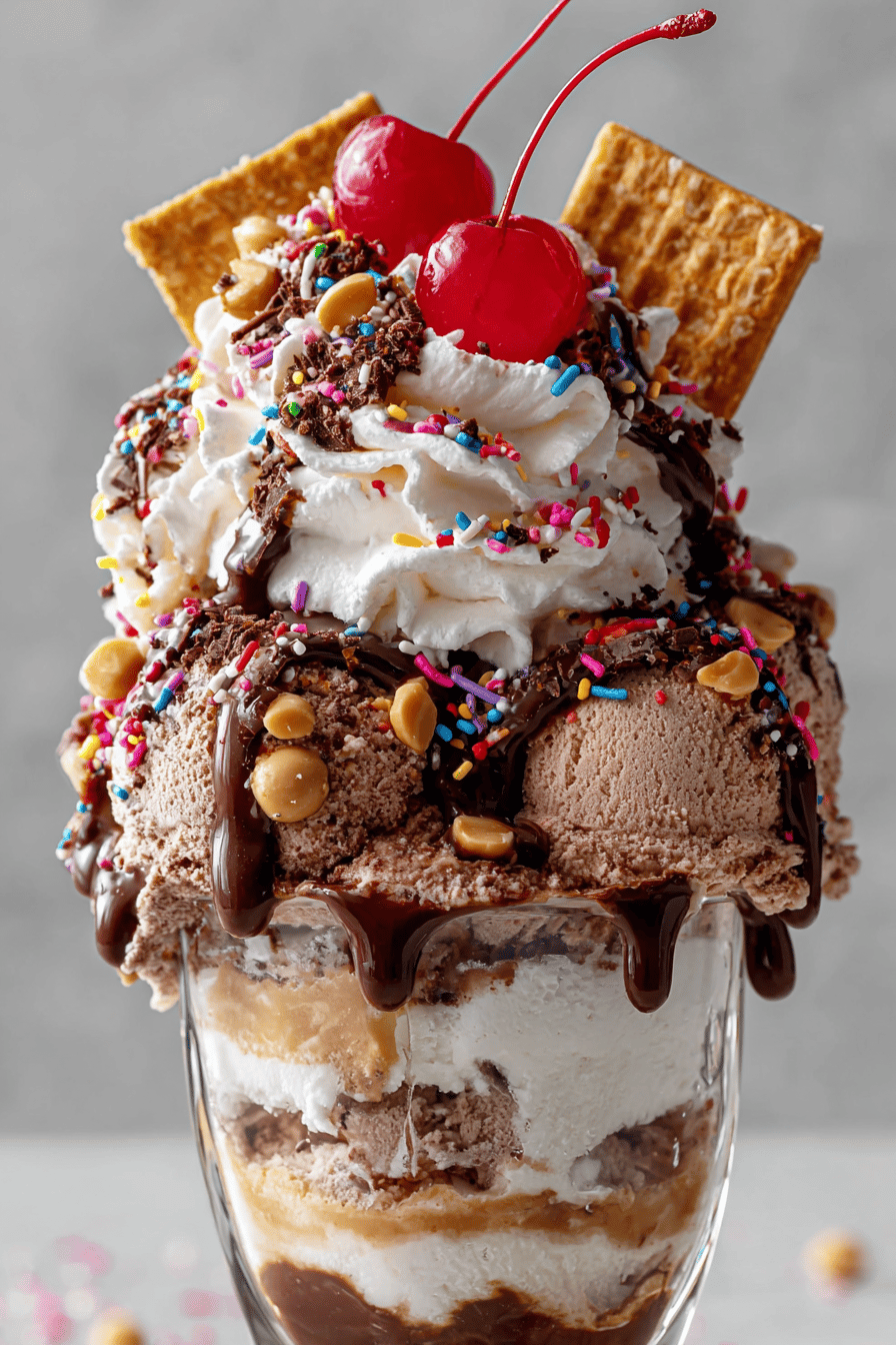 - 13. Spoon some warm peanut butter fudge into bottom of sundae glass. Layer with one large scoop ice cream. Drizzle extra sauce over. Add second scoop. Finish with shards, dollop whipped cream, cherries, pirouline wafers, and colorful sprinkles if desired.
