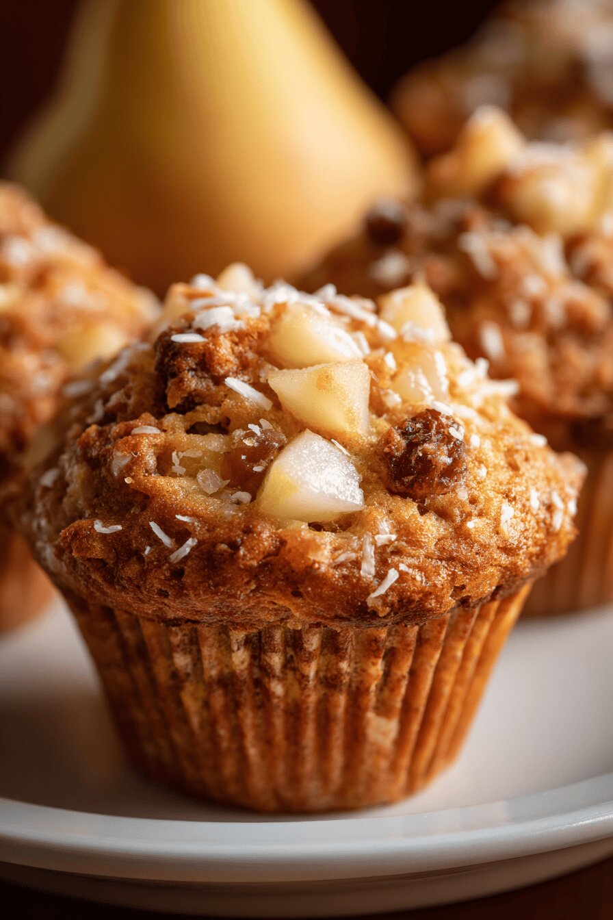 Muffins are versatile. Pears add sweetness. Dates give a chewy texture. A creamy filling makes it interesting. Coconut flakes bring a hint of tropical flavor. Great for breakfast, brunch, or snacking. Just mix dry and wet ingredients. Fill the cups. Pour in some cream cheese. Bake until golden.