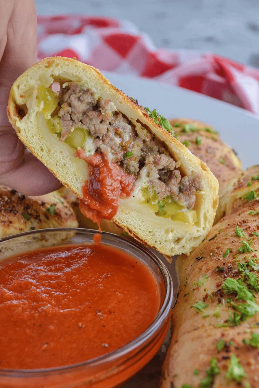 - Slice with serrated knife. Serve with warm marinara on side. Sprinkle parsley and flaky salt over slices for extra zip.