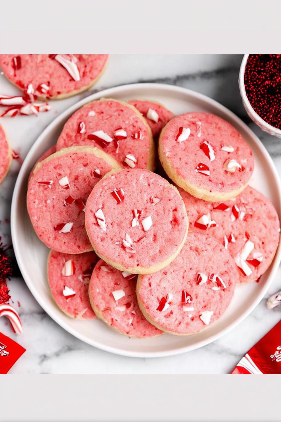 Cream butter and superfine sugar until from dull to fluffy, stopping midway to scrape ensures every bit combines evenly. Peppermint extract mixed in next creates perfume that mercilessly spreads through dough. Food coloring requires good mixing or pink splotches will annoy. Add dry ingredients in halves to ease incorporation; mixing dry flour all at once risks overworking dough which means tough cookies, not crumbly shortbread. Regular scraping the paddle and bowl prevents dry patches and pockets of flour. Incorporate candy last on medium speed to distribute chunks without pulverizing. Form log roughly 12x2 inches so slices even thickness—measure with ruler, trust you’ll get consistent bakes. Wrap tight; chilling firms dough so slices clean, not smooshed mush. Oven at 350°F high enough to set edges but not burn. Slicing cold dough forces uniformity; soft dough breaks or smears. Place slices spaced at minimum 2 inches; watch cookies spread. Bake about 10–13 minutes but rely on sensory cues: edges whisper light gold, center looks matte, not shiny. Smell shift from sweet butter to mint signals near doneness. Overbaking produces grainy, crumbly texture. Cool briefly on tray; cookies finish setting as residual heat dissipates. Transfer to wire rack to avoid sogginess from steam. Keep stored air tight; dried out cookies lose charm fast. Tried baking directly after mixing? Disaster: dough too soft, flat cookies. Chilling critical for structure and flavor melding. Always trust feel and look over clock.