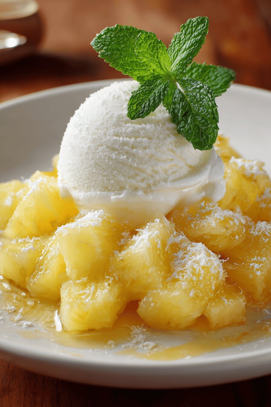 - 💡 For assembling, scoop vanilla ice cream in chilled bowls first. Then shave frozen pineapple directly over ice cream. Use light pressure so no clumps form, shavings tumble softly—snowy, not chunky. Top with macerated slices piled around and on top. Garnish with fresh lime zest curls and a few drops lime juice last step. Aroma bursts on contact, not lost earlier. Timing matters to keep texture contrasts. Serve immediately; texture loss rapid if sitting.