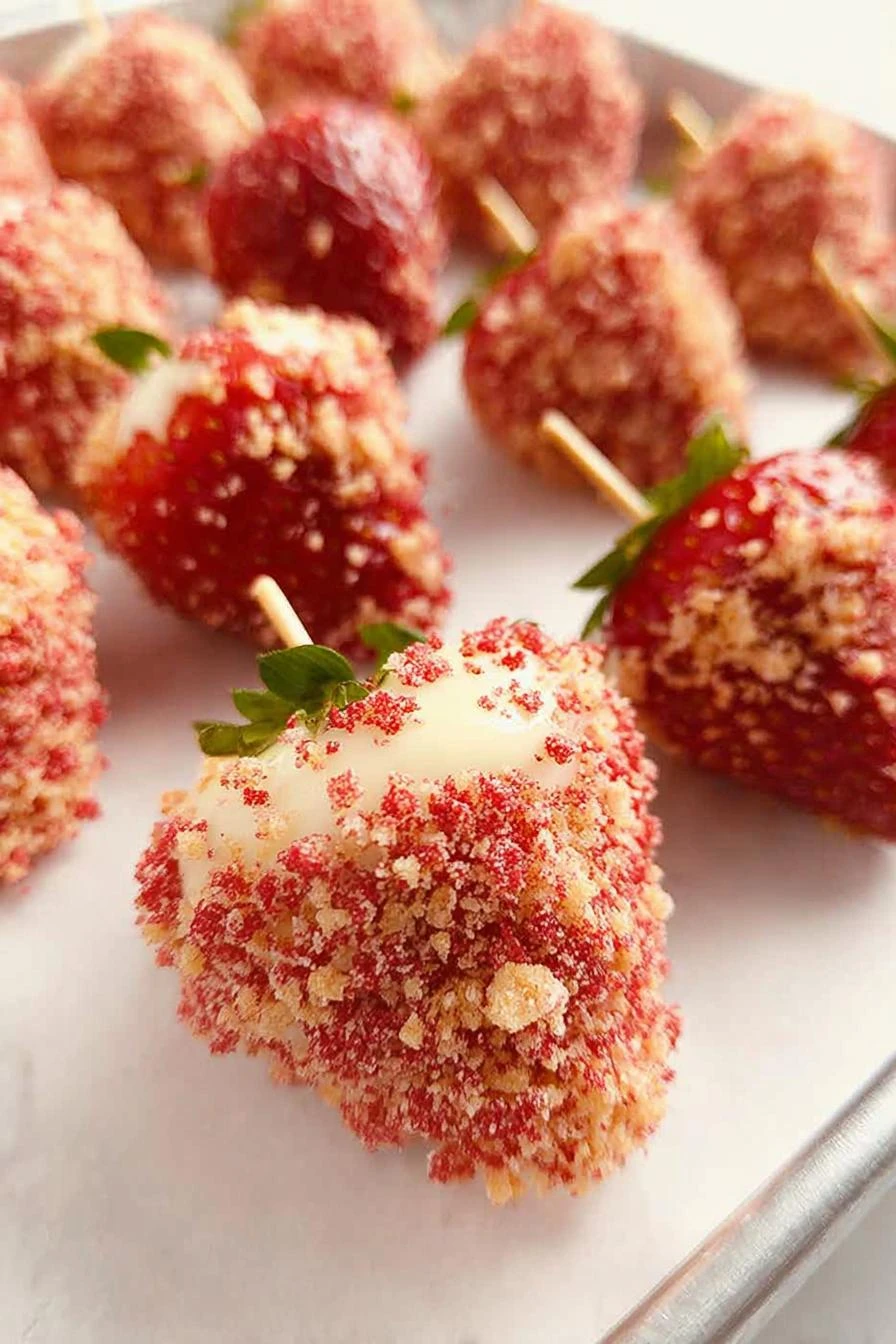 Twelve fresh strawberries. Not frozen. The texture matters. White candy melts or almond bark—either one works, they’re basically the same thing. Coconut oil or vegetable oil, just a teaspoon or two to thin the chocolate so it coats smooth. Red oil-based food coloring or beet powder for the pink. Oil-based, not water-based, or the chocolate seizes up and looks grainy. A cup of strawberry shortcake crunch topping—the actual bakery-style stuff with the little candy pieces, not breadcrumbs or anything. Toothpicks for dipping control. Parchment paper to set them on.