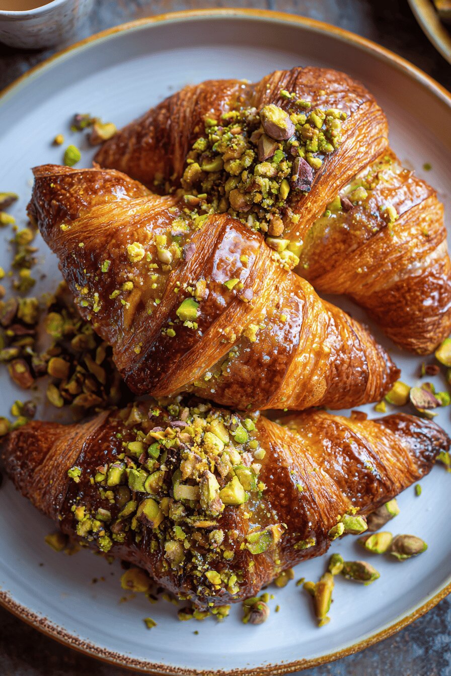 - 💡 Slice croissants with serrated knife, cut hinge style, not all the way through. Holds filling in place. Brush syrup thin inside to add moisture but avoid sogginess. Hand-beat pistachio paste with softened butter for creamy texture, avoid over-processing nuts or paste turns oily. Reserve portion of paste for topping adds color and crunch contrast when baked. Lemon zest in syrup keeps glaze sharp and fresh, swap with orange if prefer mellow tone but expect sweeter finish.