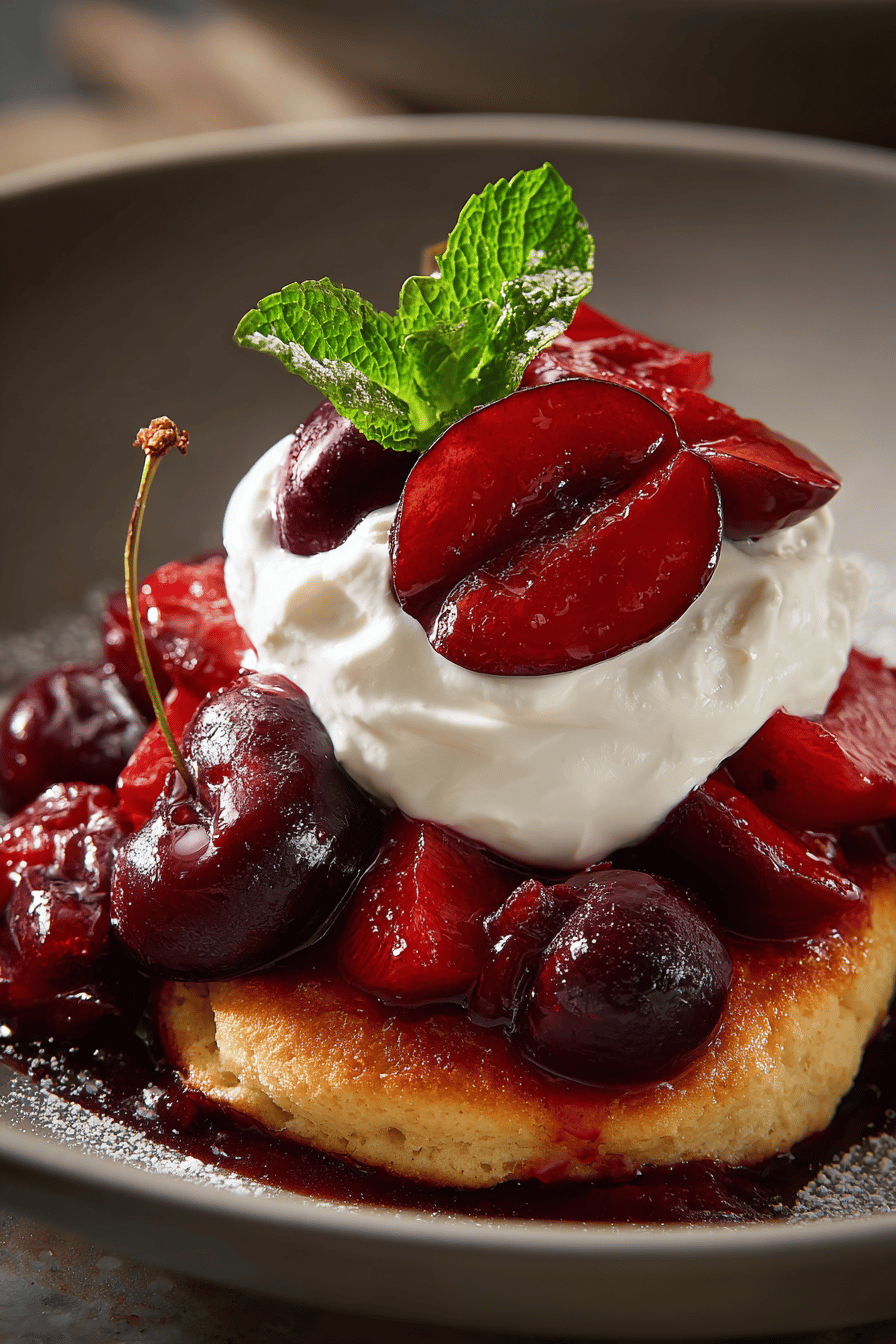 - 💡 Whip cream cold slowly starting low speed. When soft peaks form, add maple syrup and vanilla. Whip to peaks that hold but not stiff. Too long? Butter forms, too short? Runs off compote. Keep eyes on texture changes. Spoon compote thickly, fruit chunks over edges. Cream dollops layered; top halves sandwich carefully to avoid crushing crumb. Garnish with fresh plum slices and halved cherries for texture contrasts and fresh pop.