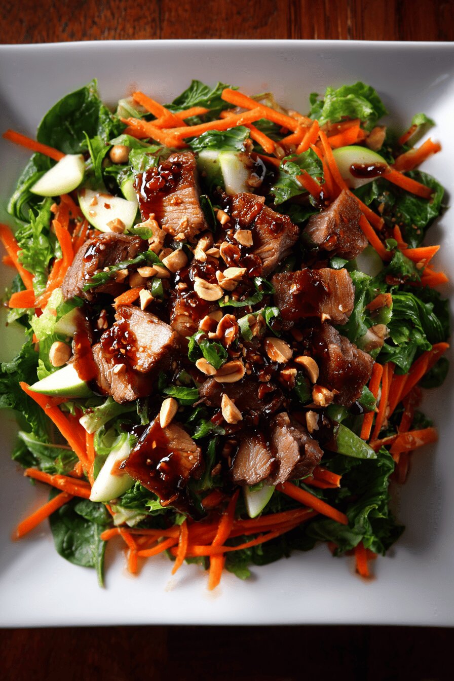 - 💡 Rest pork at least 8 minutes. Importance learned hard way—too short and juices escape with first slice, meat dries fast. While resting, blanch and prep veggies. Slice pork thin across grain for tenderness. Drizzle remaining sauce last; puddled on plate means soggy salad. Peanuts sprinkle top last second; preserves crunch and nutty aroma. Serve immediately for contrast between warm pork and crisp salad.