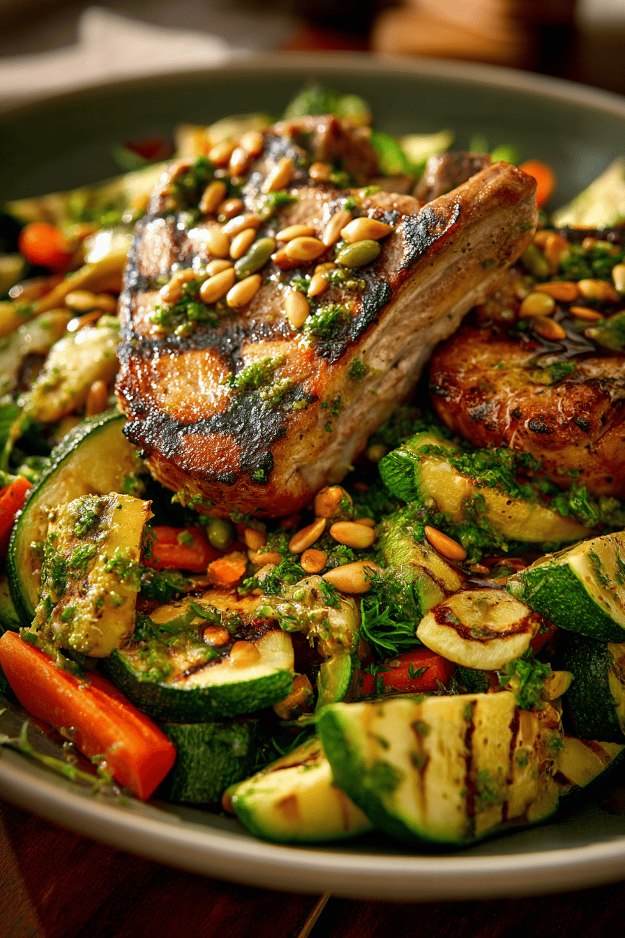 Whisk vinaigrette ingredients early to layer flavors. Garlic and ginger finely grated ensure smooth blending with oil and lemon. Season pork chops before heating pan, avoid crowding. Medium-high heat forms a crisp sear; cooking each side 5-6 minutes locks in juices. Tent under foil to rest—the pause crucial. Toss zucchini chunks with oil and seasoning separately. Use the same pan to capture residual pork flavor in zucchini char. 3-4 minute sides crisp but don’t overcook. Return zucchini to vinaigrette bowl immediately so warmth melds flavors. Stir in toasted pumpkin seeds and fresh herbs last; prevents wilting and preserves bite. Slice pork across the grain to maximize tenderness when plating. Final drizzle of extra vinaigrette uplifts the dish before serving.
