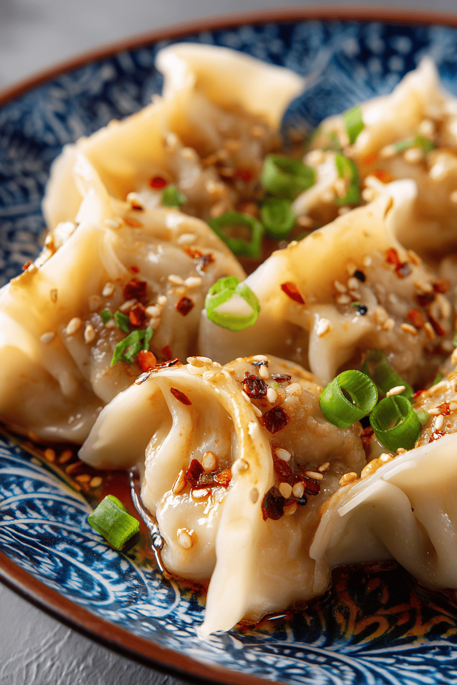 Dried shiitakes must be soaked in warm water till plump. Chop finely so filling distributes evenly. Use lean ground pork to avoid greasy dumplings. Wonton wrappers come round or square; either works. Keep damp cloth on wrappers not in use to prevent drying. Toasted sesame oil key for its nutty aroma – don’t substitute with regular sesame oils. Peanut butter with chunks for texture, not smooth paste. Water adjusts sauce consistency. Lime juice balances richness with acidity; fresh ginger and garlic vital for depth and a little heat. Chili flakes optional but recommended for added warmth. Honey for subtle sweetness. Freeze dumplings after boiling and draining for best results when reheating later.