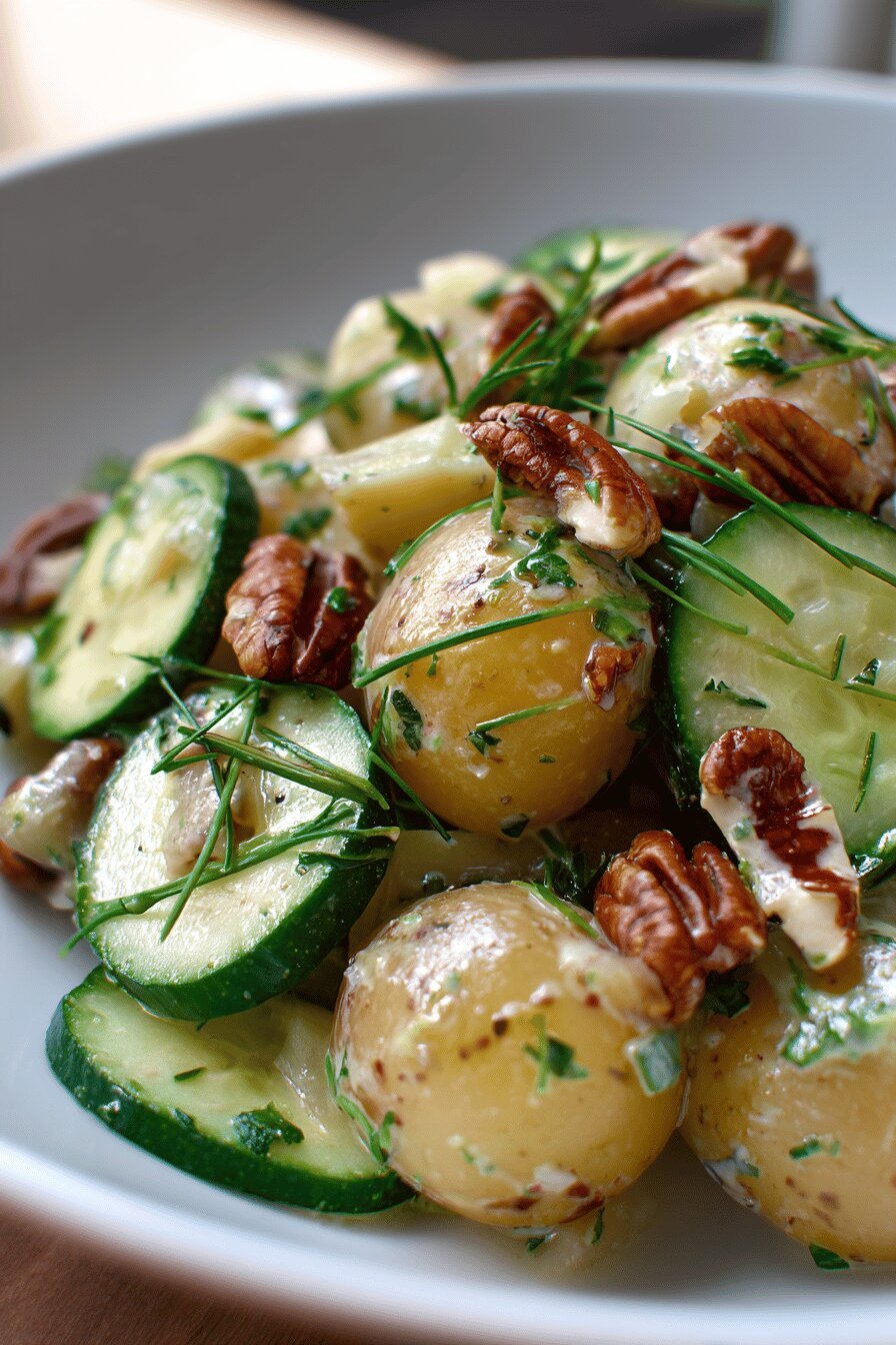 Small potatoes, keep unpeeled or scrub well, skin adds texture and nutrients. Jerusalem artichokes—cored or peeled? Either works, peel if skin tough or dirty. Match cut sizes for even cooking. Pecans toasted—watch not to burn, brings nutty flavor. Cucumber peeled and seeded prevents watering down salad. Lime juice and zest fresh, key for brightness. Mayonnaise base creamy but swap brands if allergy issues. Fresh herbs—chives, thyme, mint—chopped finely for even distribution. Salt pepper steady, adjust to taste. Measure liquid ingredients precisely for balance.
