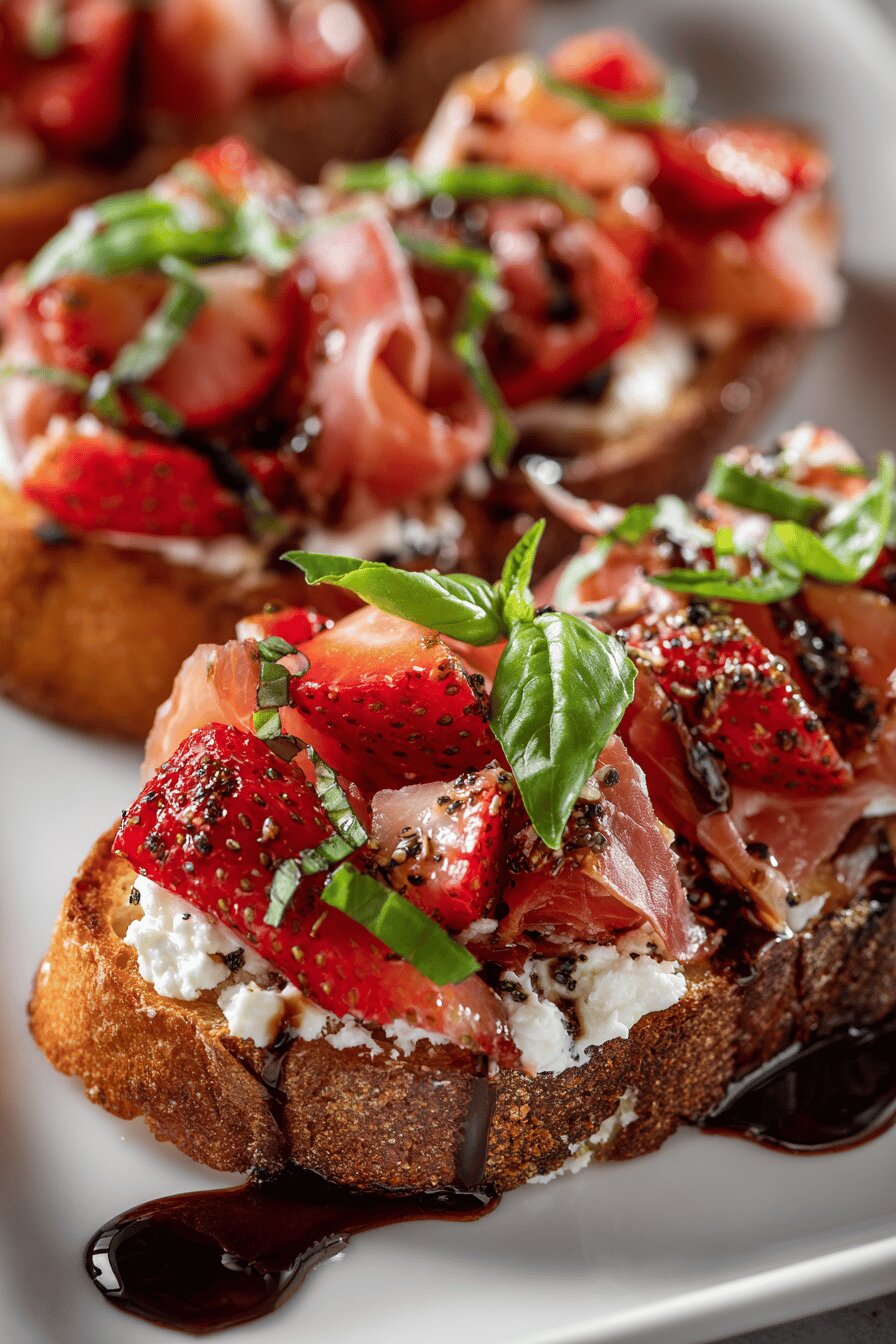 This dish features grilled country bread topped with herbed cream cheese, prosciutto, and fresh strawberries. The blend of flavors is heightened by balsamic glaze and fresh basil. Elevated yet simple. Good for an appetizer or snack.