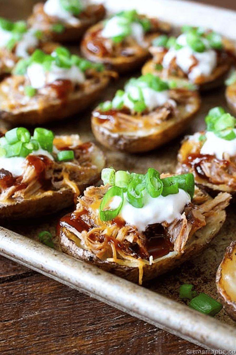 - Fill skins with warm pulled pork, pile up. Sprinkle smoked gouda on top. Slide back into oven ~6 minutes until cheese bubbles, pools nicely but not burnt. Pull out, drizzle Stubb's Sweet Heat Bar-B-Q or your fave. Add dollop sour cream, scatter green onions. Eat immediately raw heat pops, sharp cheese aroma, soft pulled pork texture with crisp skin underneath.