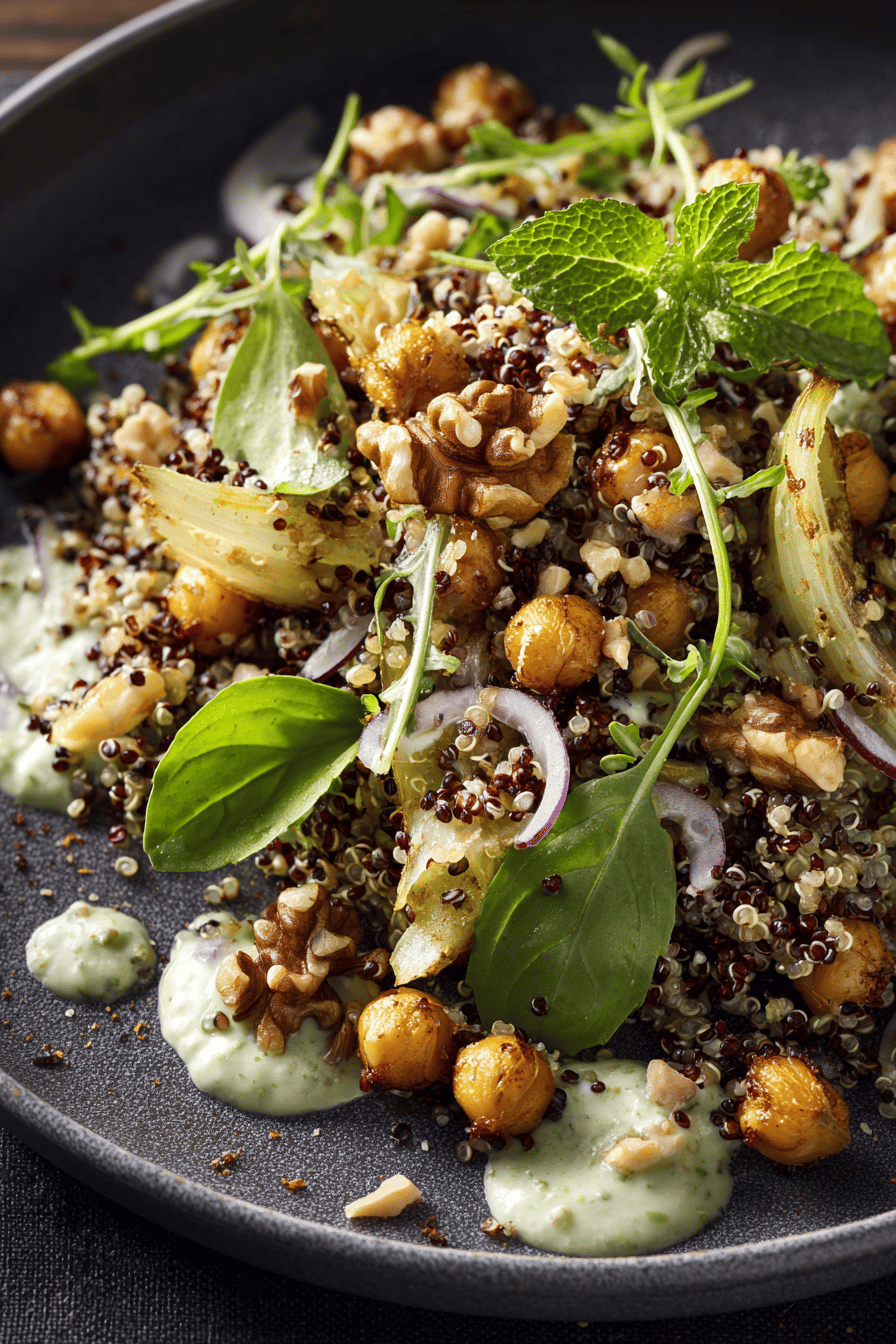 - Plate salad in shallow dishes, mound walnut-chickpea mixture on top—serves bite contrast: creamy quinoa, crunchy chickpeas and nuts, crisp veggies, peppery leaves. Scatter basil and mint leaves for fresh herbal lift, torn into bite sizes. Add an extra dollop of dressing on each plate just before serving.