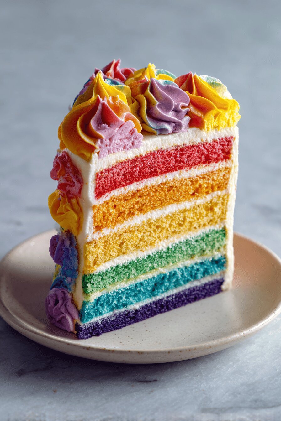 - Continue using colored frostings in order: purple, blue, green, yellow, orange, repeating dot-then-smooth technique. Each color band should overlap slightly to avoid cake showing through but not bleed into others. Slow turns of cake while working helps. Mistakes? Chill cake, scrape off frosting edges gently with warm metal spatula and redo.