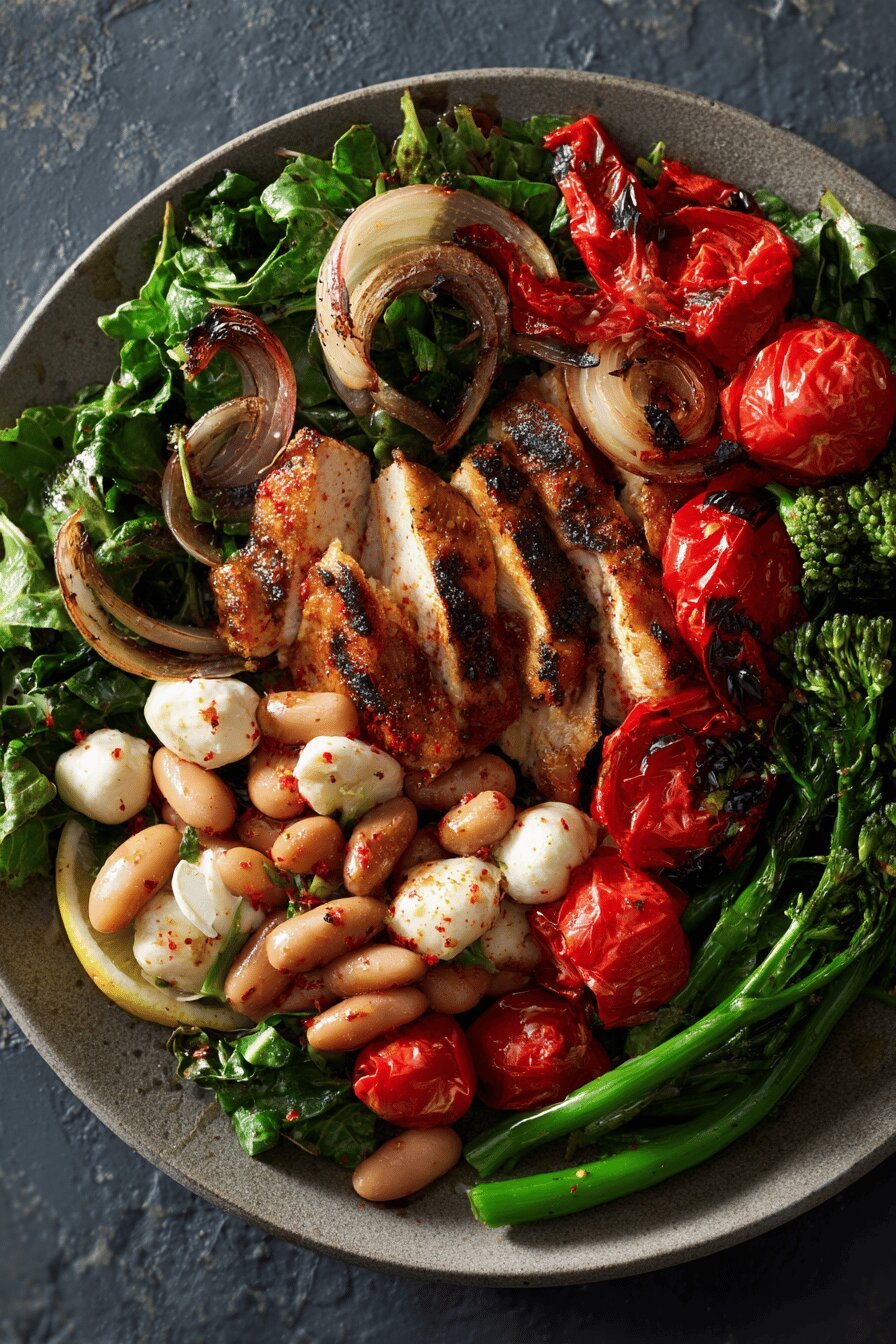 - If no grill, sear chicken in hot cast iron or broil under oven until just opaque throughout. Grill veggies on stovetop pan with slight char or roast in oven 200C until softened and blistered.