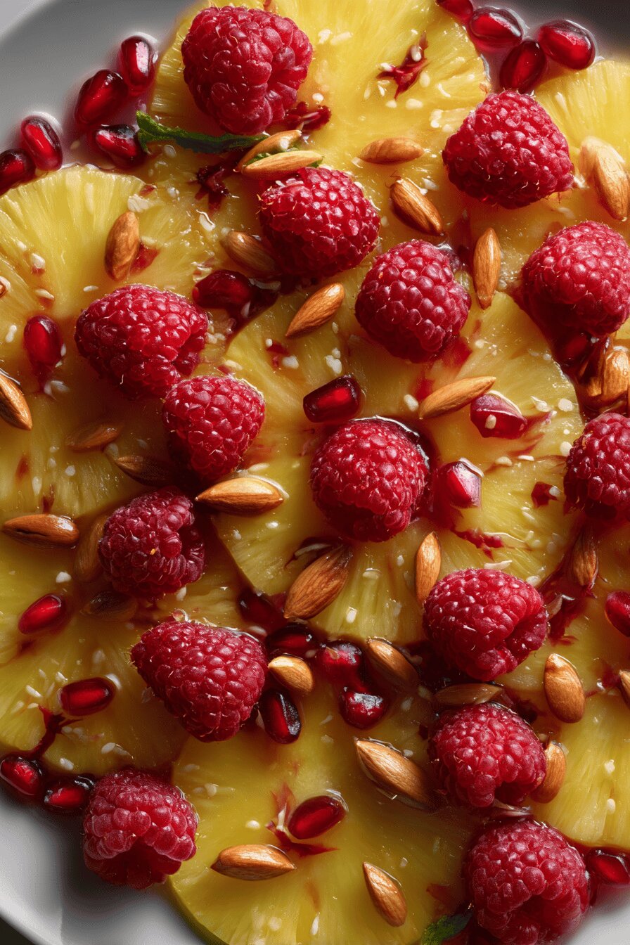 - Serve immediately or chill briefly. Pineapple should feel vibrant, not limp. Nuts stay crisp. Raspberries pop freshness. Sunny, rich aromas unfold in each bite.