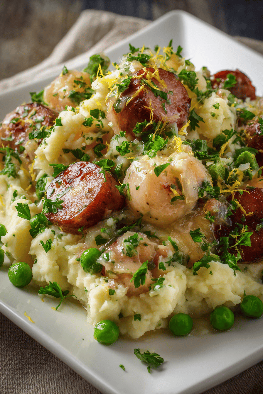 - 💡 If sauce thickens too fast, reduce heat immediately and add more stock in tiny increments rather than all at once. Sauce can break if temp jumps too much or flour not toasted. Butter quantity split keeps mash from greasy but sauce rich. Peas never boil directly frozen or they lose crunch and color quick; thaw first in fridge or room temp. Parsley bruised gently before chopping or dries out dulls color fast. Shallots chosen over onions; milder, less sharp, keeps sauce clean. Sweet Italian sausage substitution simplifies ingredient sourcing; mild spice avoids overwhelming garlic and lemon. Mash can be warmed gently if sitting before plating; cover to avoid drying out. Sauce texture depends on stock richness; fresh stock thicker than commercial broth so reduce flour 25% to compensate. If potatoes watery, steam off longer uncovered before mashing to absorb moisture.