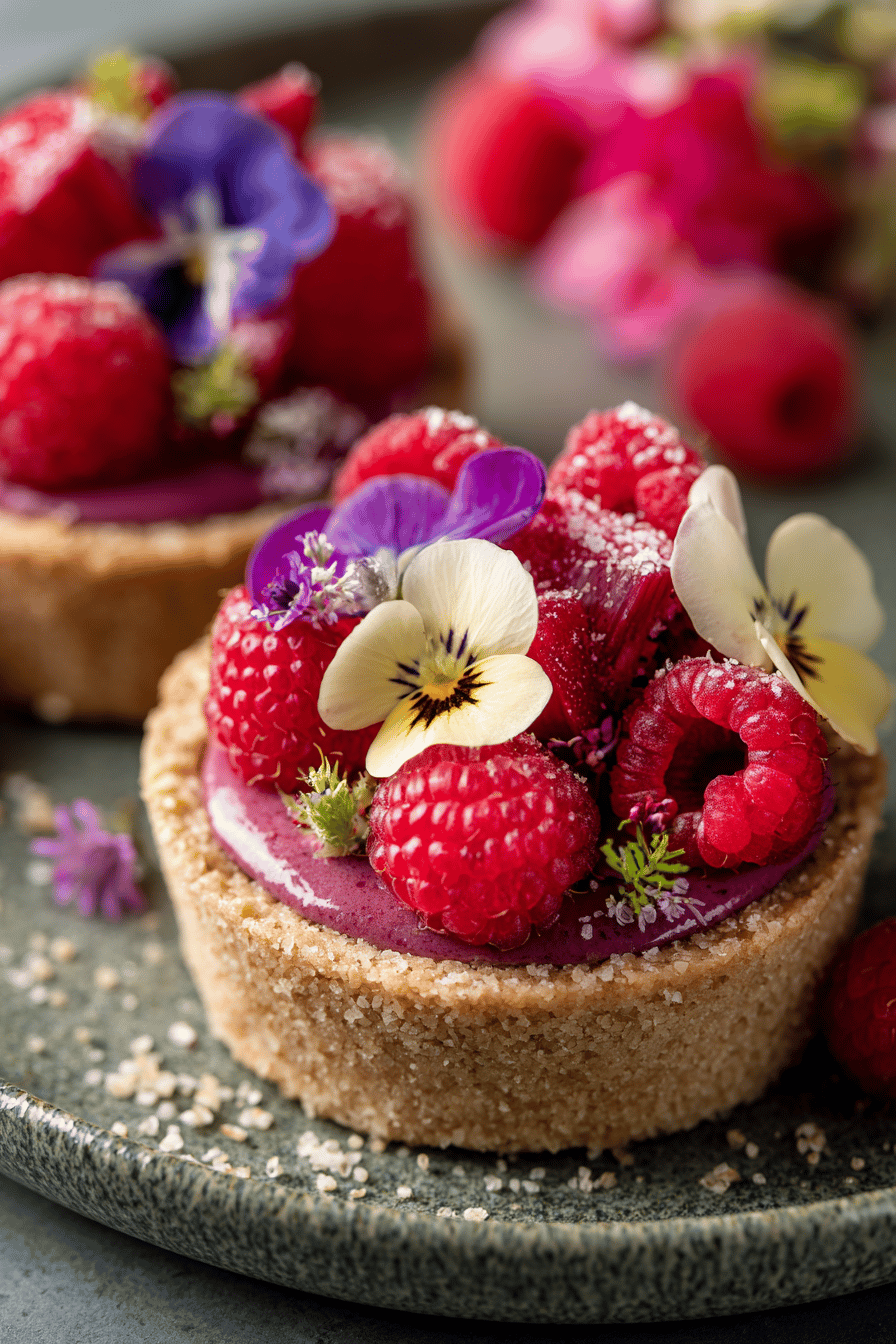 Small tart bases topped with a rhubarb and raspberry mousse frozen into rings then filled with fruit purée and fresh raspberries. The dough mixes almond powder and is baked to slightly golden. Gelatin sets the mousse, which freezes before assembling. Tangy, refreshing, with floral garnishes optional. Variations replace rhubarb with tart cherry and almonds with pistachios. The purée boils then blends, cream whips lightly with sugar added for texture, freezing gives shape and then softens in fridge.