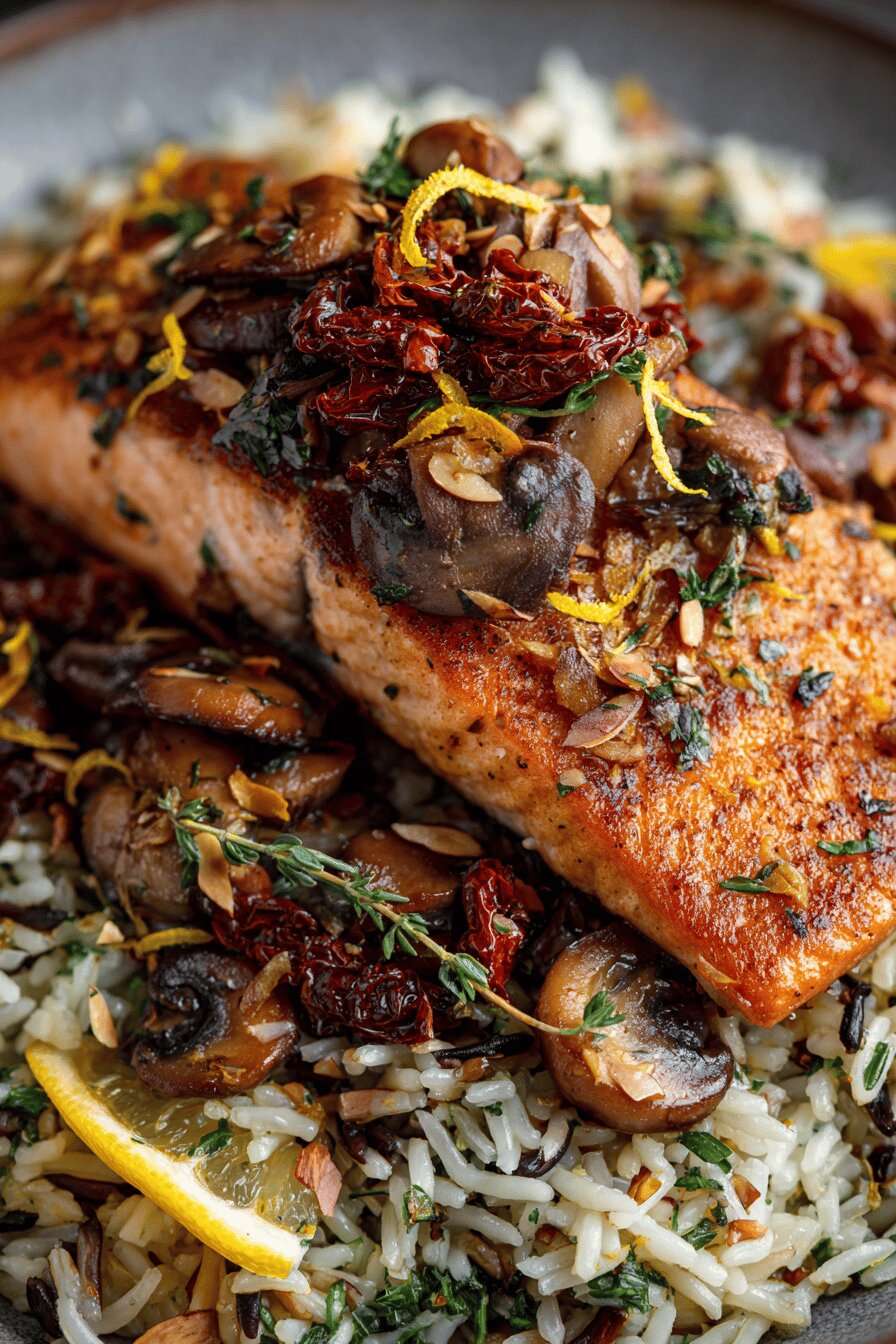 Start mushroom sauté hot pan, use butter for flavor and browning. Stir occasionally but avoid overcrowding. Add sun-dried tomatoes after mushrooms are brown so oils release into pan. Simmer broth to reduce liquids, concentrate umami. Cornstarch slurry mixed cold keeps sauce smooth—pour slowly, stir constantly to avoid lumps. Keep sauce simmering during thickening, quick process. In separate pan, salmon seared on med-high, plenty of oil to crisp outside while keeping interior juicy. Four to five minutes per side depending on thickness. Season as you cook. Citrus zest and thyme right after cooking keeps freshness intact. Serve hot over rice with nut garnish to bring mouthfeel contrast. Final plating quick before sauce cools and sets. Timing adjusted by ±5 minutes total for ideal mushroom tenderness and fish doneness.