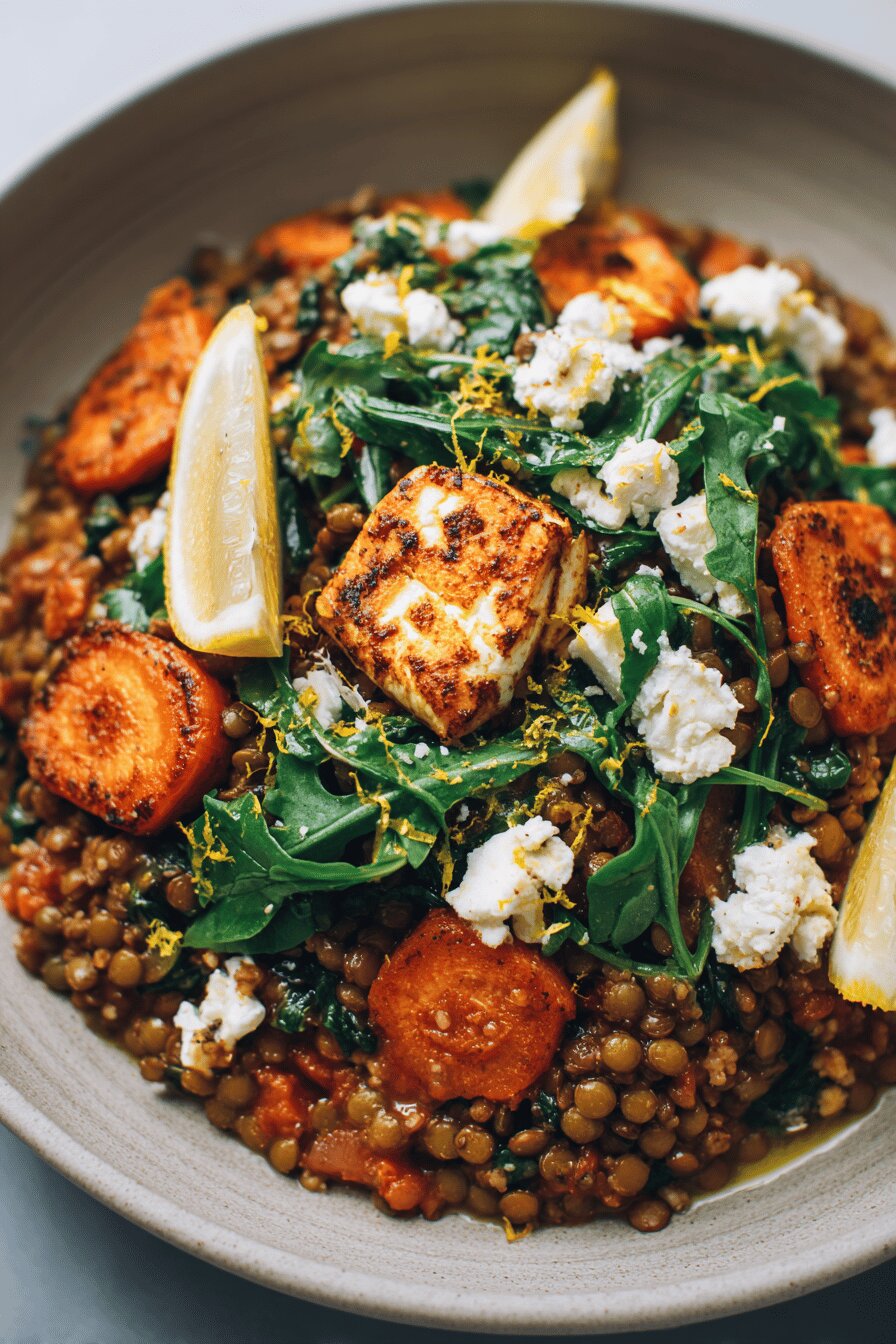 - Plate couscous base then spoon lentil-tomato mix over. Arrange roasted carrots atop. Scatter mizuna leaves and crumbled halloumi for pepper, creaminess contrast. Finish with fresh lemon zest. Serve warm or slightly cooled for best flavor.