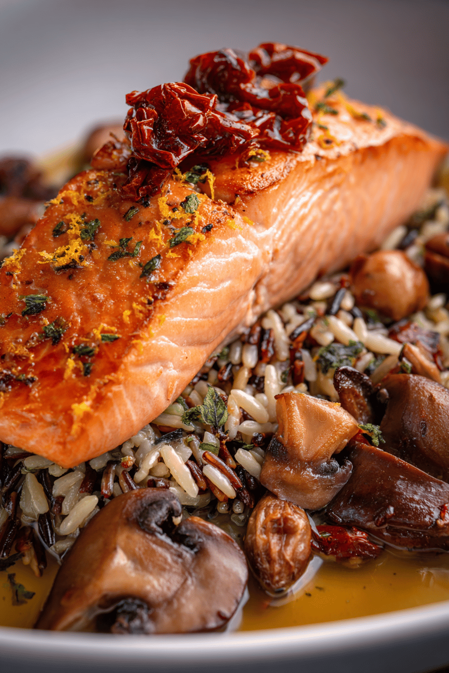 Mushrooms are the heart here. Oyster, shiitake, cremini—different textures and flavors. Don’t substitute with button mushrooms; too bland. Use unsalted butter for controlled seasoning and a rich mouthfeel. Sun-dried tomatoes add tang and umami; oil-packed ones for moisture, drained well. Chicken broth builds base flavor—or vegetable broth if you prefer. Cornstarch slurry thickens without lumps; mix thoroughly before adding to pan. Orange zest is bright but subtle; avoid zesting white pith, can be bitter. Salmon skin removed for an easy bite, but you can keep it if you like crunch. Olive oil for searing, with high smoke point and fruity notes. Wild rice with pine nuts and herbs offers texture and a nutty counterpoint to the fish and mushrooms.