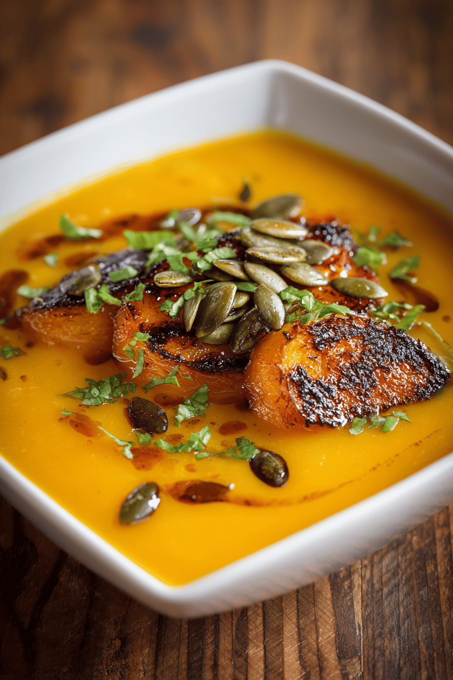 Grill cubed and peeled spiced squash on high heat, mark with char. Sauté onion and garlic in butter, add squash and chicken broth. Simmer until tender. Puree until velvety. Toast pumpkin seeds as garnish. Adapted with coconut oil for perfume, quantity tweaks to squash and broth. Times shifted slightly. Minimal fuss, maximum aroma. No nuts eggs gluten or dairy (except optional butter).