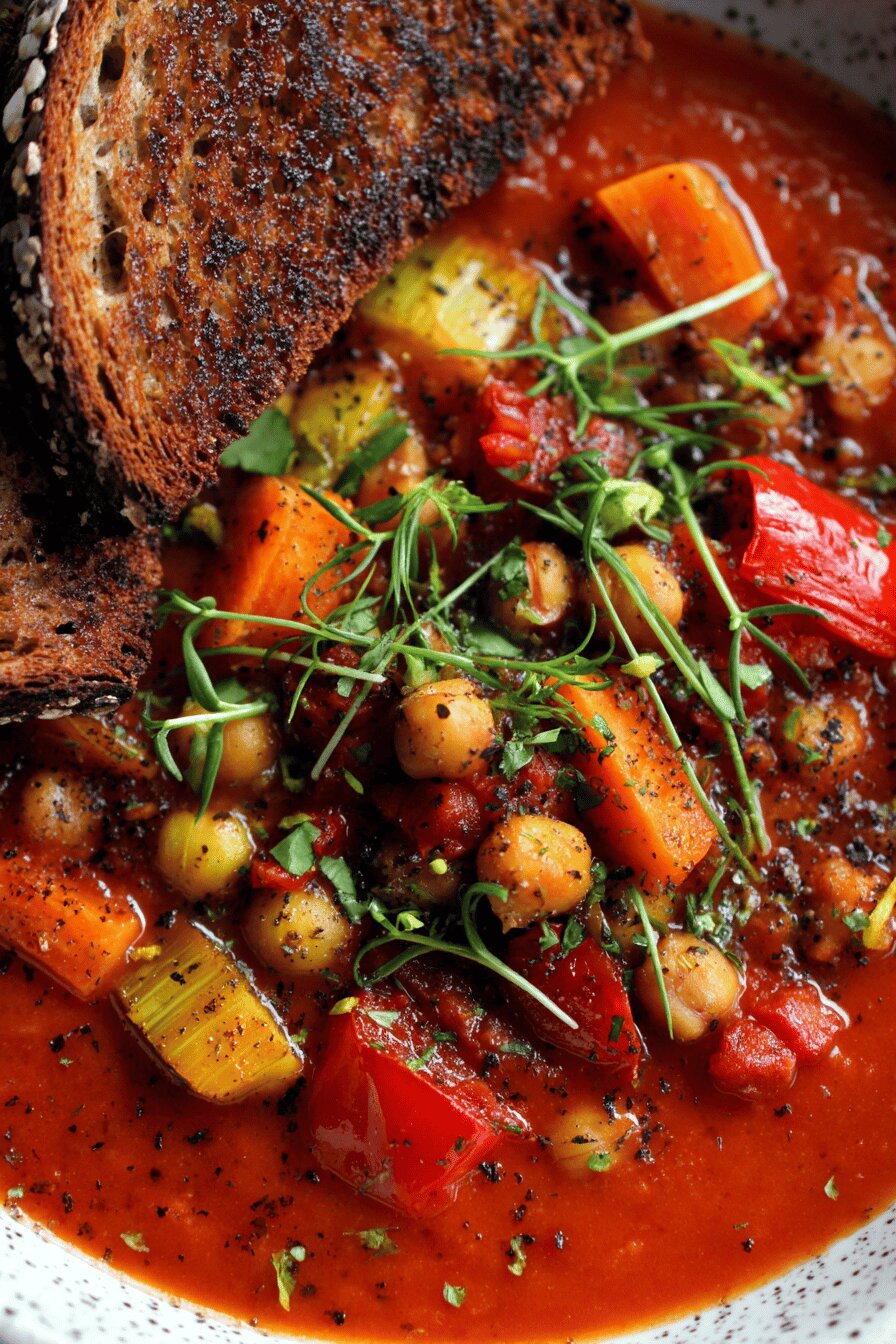 Red peppers swap for yellows in original — provides deeper flavor and color contrast. Leeks add sweetness and earthy aroma, complement carrot’s natural sugars, replacing alliums with sharper edge of onions. Chickpeas subbed for beans for creamier texture and higher protein content; they hold shape better while simmering. Fire-roasted diced tomatoes bring smoky notes absent in plain canned tomatoes, layering taste. Olive oil trimmed to keep lightness. Fresh thyme adds complexity without complexity. Salt and pepper used sparingly to not overpower natural vegetable flavors. Toasted rye bread recommended over country bread for heftier bite and rustic feel. Ingredients straightforward, pantry staples, accessible year-round. Can opt for vegetable broth for vegan variation. Fresh thyme can be dried if unavailable, although fresh preferred. Rinsing chickpeas important to reduce excess sodium and canned packing taste. Proper roasting crucial — allows caramelization essential for flavor depth. Parchment for easier cleanup and prevents sticking. Recipe arranges technique to enhance each element’s contribution to final dish.