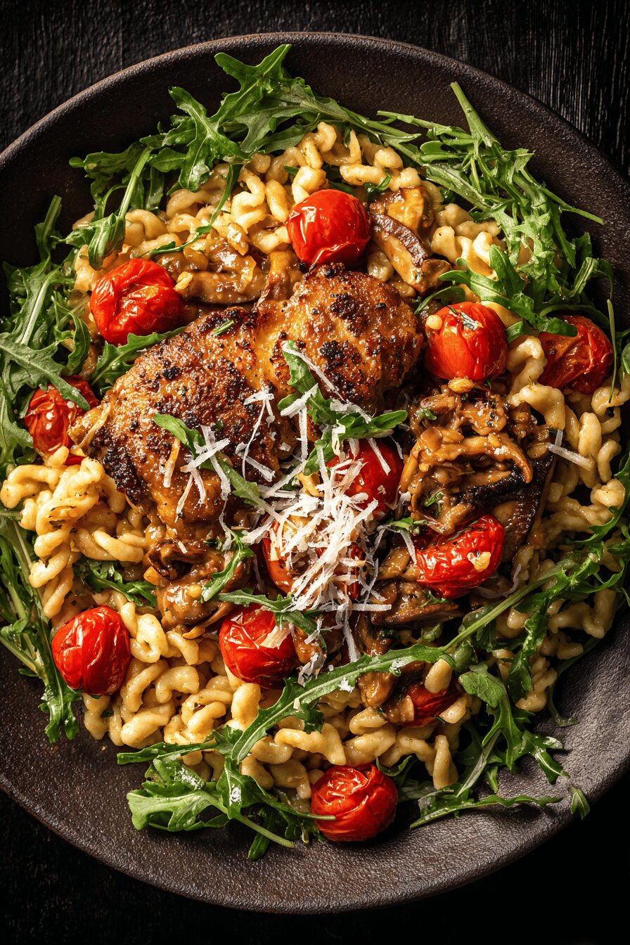 Chicken thighs can be swapped for boneless turkey pieces or firm white fish chunks for lighter version. Shiitake mushrooms bring strong flavor; if none, use cremini or portobello as fallback. Shallots better than onions here; their mild sweetness avoids overpowering. Cherry tomatoes preferred for skin-thin burst of flavor and juice; roma tomatoes work if halved small. Spätzle can be replaced by egg noodles or gnocchetti, watch cooking times as they vary. Pecorino romano in place of parmigiano adds sharper tang, salt; good quality aged cheese essential. Arugula is key, peppery bite brightens. Olive oil must be good—don’t skimp. Chicken broth homemade or low sodium store-bought; adjust salt in final step. Garlic doesn’t get overcooked here—adds mild background aroma. Keep ingredients fresh, fresh is noticeable in end texture and flavors.