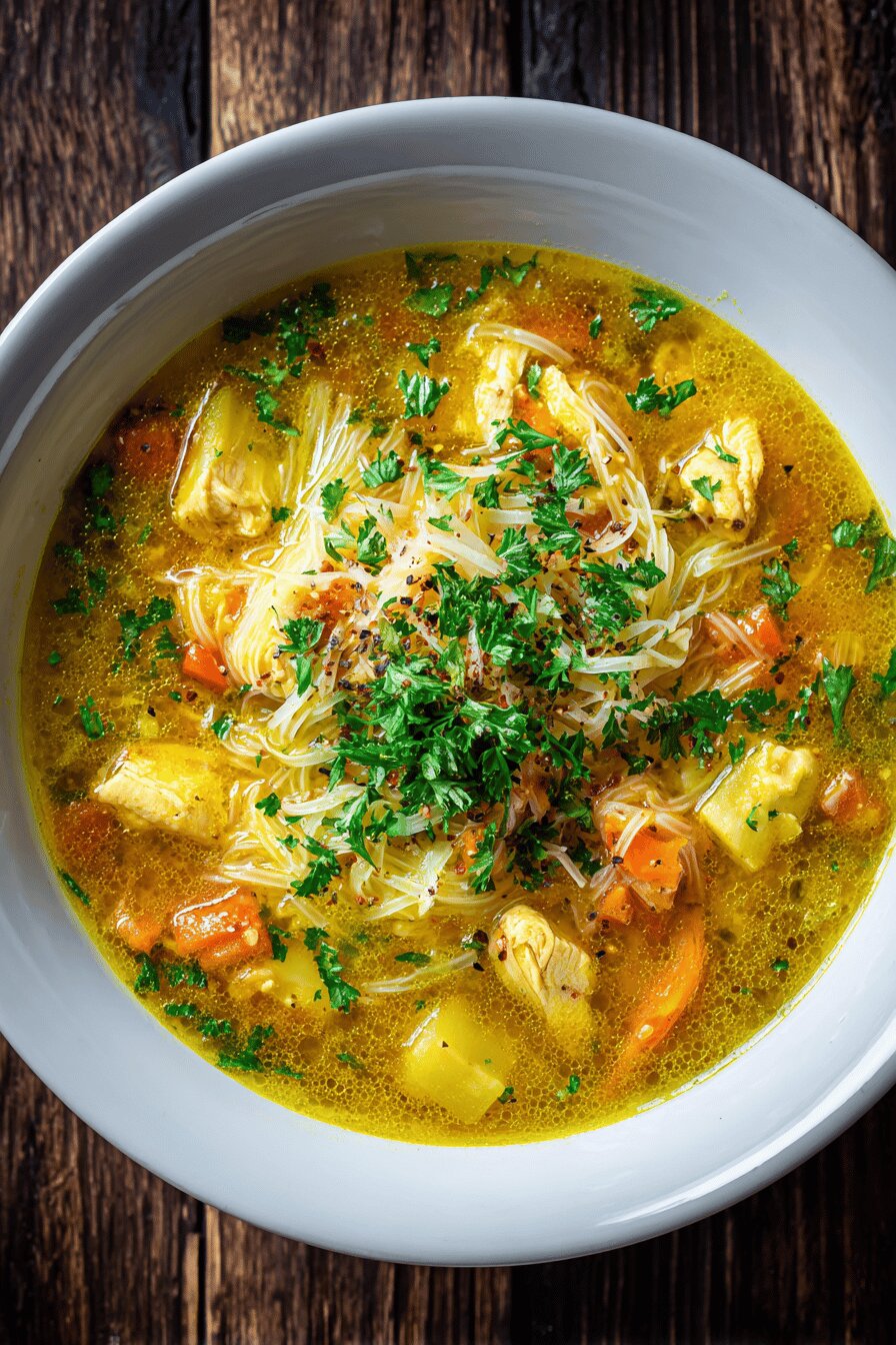 - 💡 Add vermicelli last; broken small to avoid giant clumps. Cook 3–6 minutes max. Watch noodle texture carefully—soft but still firm to bite, no mush or pasty. Fold shredded cooked chicken in last, just warm through. Overheat = dry meat, cloudy broth. Adjust salt and pepper final step—taste always shifts after simmering noodles and meat mixed in.
