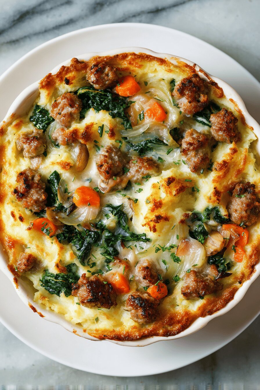 Drain sausage fat mid-cook. Mushrooms dry fry edges before adding kale. Salt mushrooms after sweating draws out moisture. Avoid overcooking mash so excess moisture doesn’t run down. Bake time key toaster for evaporation. If watery, next time press layers tighter. Let pie rest before cutting to firm layers better.