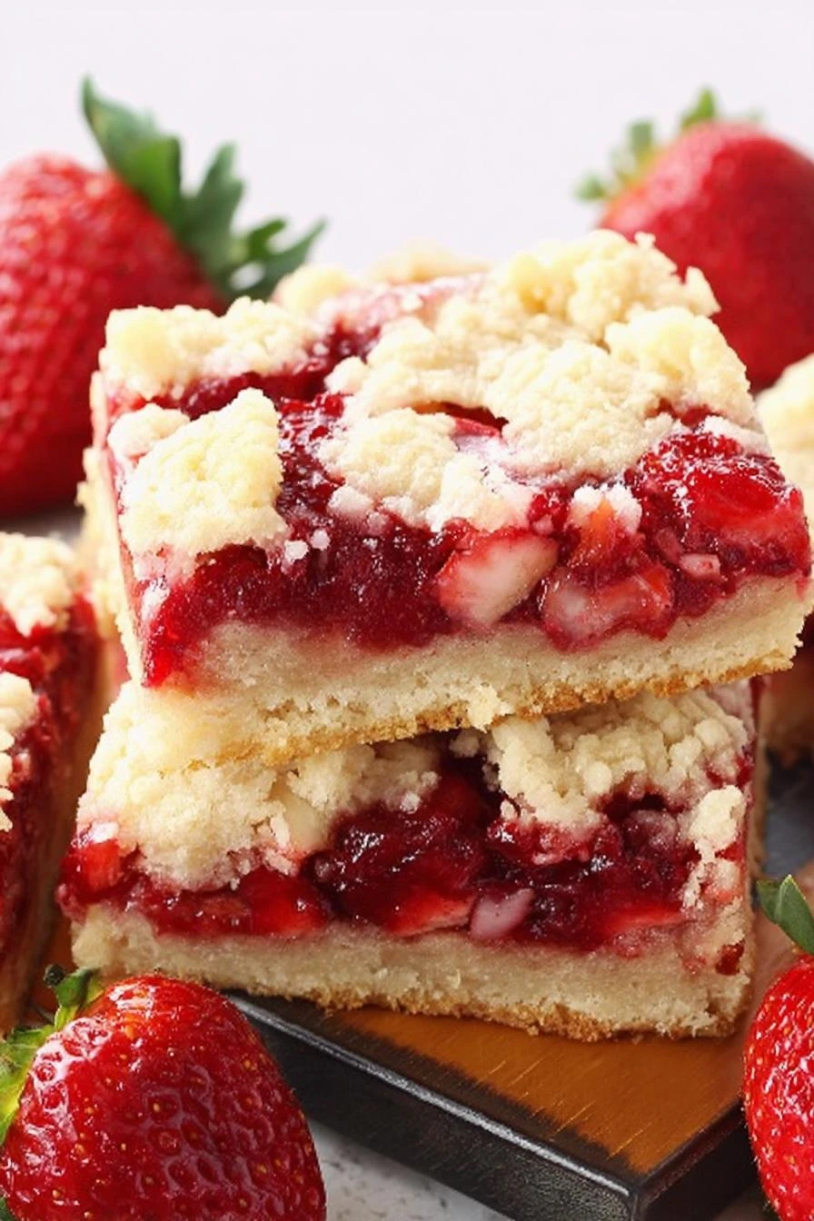 Strawberry bars with a crumbly, buttery crust, tart lemon zing, and a juicy berry filling. Adjusted flour and sugar to tweak sweetness and texture. Butter worked in until pea-sized crumbs—never fully melted—crucial for flaky crust layers. Eggs bind just enough. Toss fresh or frozen strawberries with lemon juice and cornstarch for thickening, but watch juices. Bake until the crust crisps and crumb turns golden. Easy to lift from pan with parchment overhang. Good cold or room temp. Perfect for summer stash or last-minute dessert.