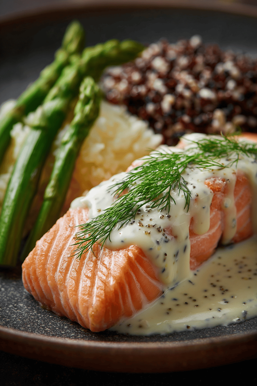 Refrigerate salmon and sauce separately if possible. Store in airtight container, keep sauce chilled tight to prevent thick skin formation. Reheat gently on low heat, stir milk sauce slowly. Avoid microwave high heat; sauces separate fast.