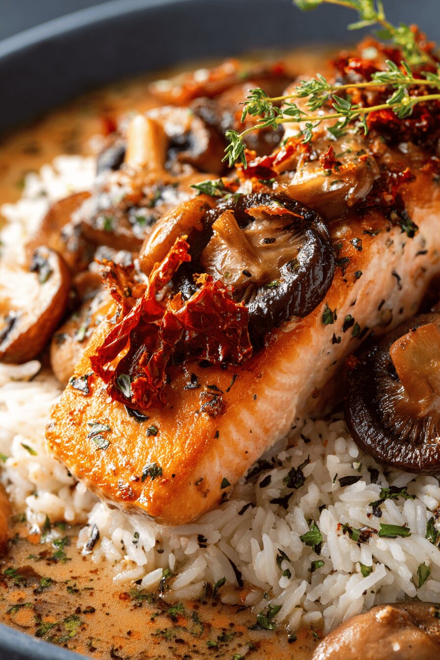 Reduced mushroom weights to lighten earthiness. Oyster and cremini soften plus shiitake chew. Vegan butter swaps for dairy butter keeps no lactose. Vegetable broth replaces chicken stock for plant-based flexibility but trust savory depth. Arrowroot powder in place of cornstarch holds better sheen and gloss, slightly slower thickening but more translucent sauce. Sun-dried tomatoes cut back for balance. Oil choice shifted to heartier avocado oil for searing. Orange zest kept whole for brightness. Fresh herbs optional but thyme perfect with mushrooms and fish. Salt and pepper essential. No nuts in main recipe; pine nuts in rice optional homemade touch. Technique trumps added flavor bombs here.