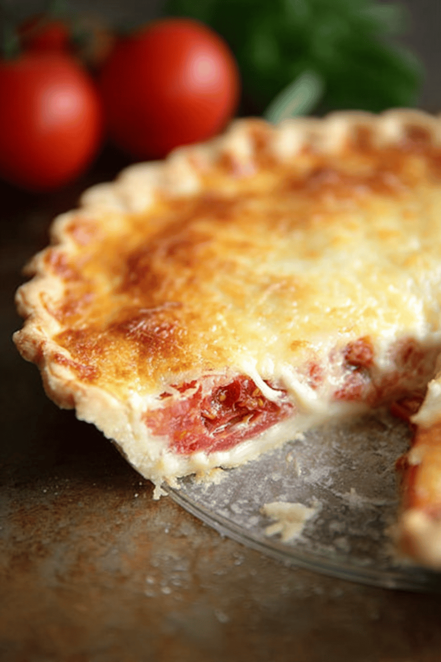 Layered tomato pie with mozzarella, Parmesan, mayo, basil, and onion baked in a flaky crust. Moisture control key. Resting time crucial to set filling. Golden, bubbly cheese topping signals doneness. Substitute Greek yogurt for mayo for tang, or swap mozzarella with provolone for sharper bite. Use sweet onions or scallions instead of regular onion to change aroma. Prep involves salting tomatoes to bleed out excess juice, preventing soggy crust. Serving after resting improves slice integrity. Rimmed pan protects oven from drips. Experience shows blotting tomatoes twice crucial. Flavor builds over time, layers melding with baking.