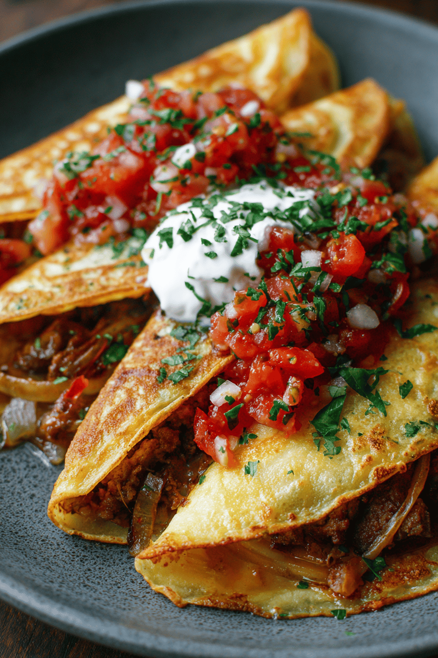 - 💡 Serve hot immediately. Sour cream dolloped warms tongue, cuts fat and heat. Offers balance. Extra salsa on side for dipping. Avoid letting folded crêpes sit too long. Cheese cools and hardens. Crust softens if resting. Best texture and flavor straight from pan. Use nonstick pans for easiest release and browning. Adjust batter thickness slightly for altitude or ingredient variances.
