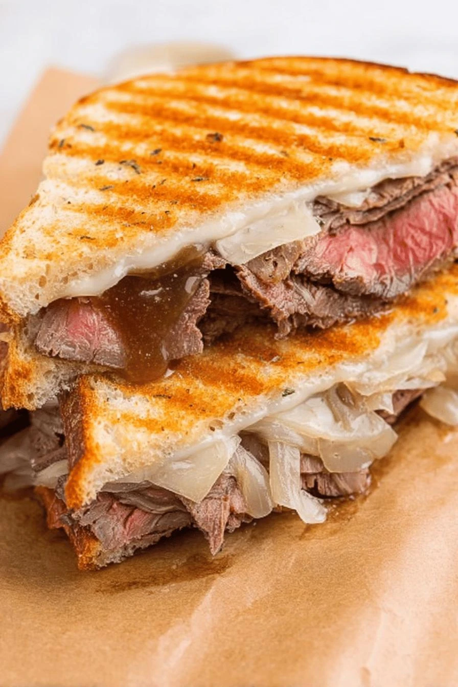 Takes 30 minutes start to finish. Not complicated. Feels like you made something. The au jus—that’s the real thing here. Warm dipping sauce, rich, not watery. Worcestershire does something to beef broth that tastes expensive but costs nothing. Caramelized onions actually stay on the sandwich. Not sliding out. They stick. That’s because you caramelize them first, save some, build with intention. Comfort food that doesn’t need a recipe rehab. Just a panini press and beef you probably have around anyway. Works for dinner, works for lunch the next day when it’s somehow better. Cheese melts into actual cheese, not a plastic sheet. Havarti does that. Swiss too. It matters.