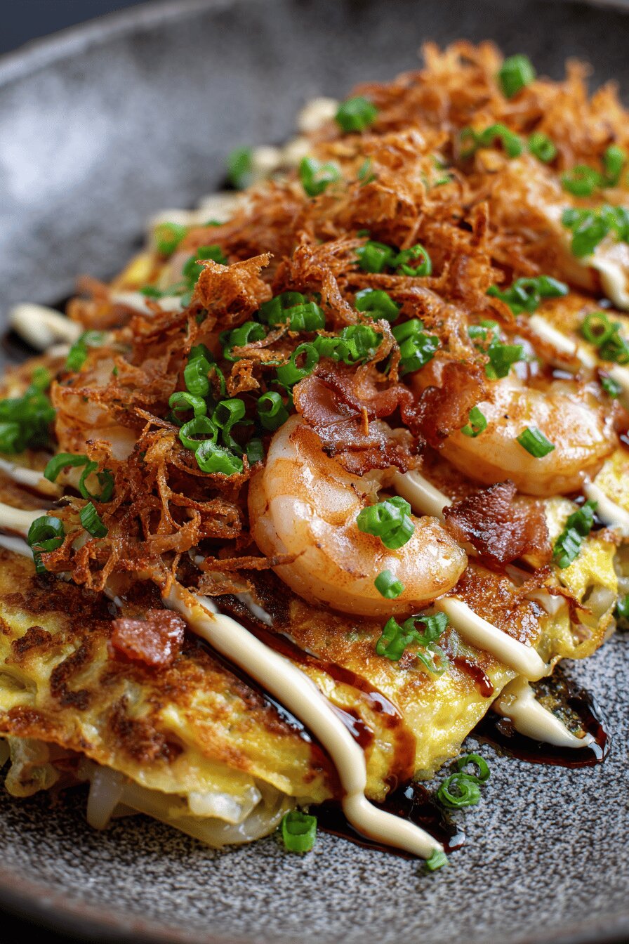 Eggs large and fresh make a fluffier base. Use unbleached flour for better texture. Napa cabbage is preferred for sweetness and softness but you can use green cabbage if necessary; just cook a little longer so it softens uniformly. Tamari is a gluten-free soy sauce alternative that brings depth without too much salt. The smoky pancetta adds fat and flavor, substituting original bacon or lardons. Sesame oil, added to the batter, introduces warmth and nuttiness, shifting the flavor profile slightly Asian-Italian. Green onion in batter. Yellow onion for sweetness and crunch if not fully cooked soft. Raw shrimp are peeled and chopped for bite-sized morsels. Dried seaweed powder or shredded nori for subtle umami topping. The crispy fried shallots replace bonite flakes for crunch, though bonito imparts smoky seafood notes. Japanese spicy mayo gives zing versus plain mayo. Tonkatsu sauce for sweet tang and umami balance.