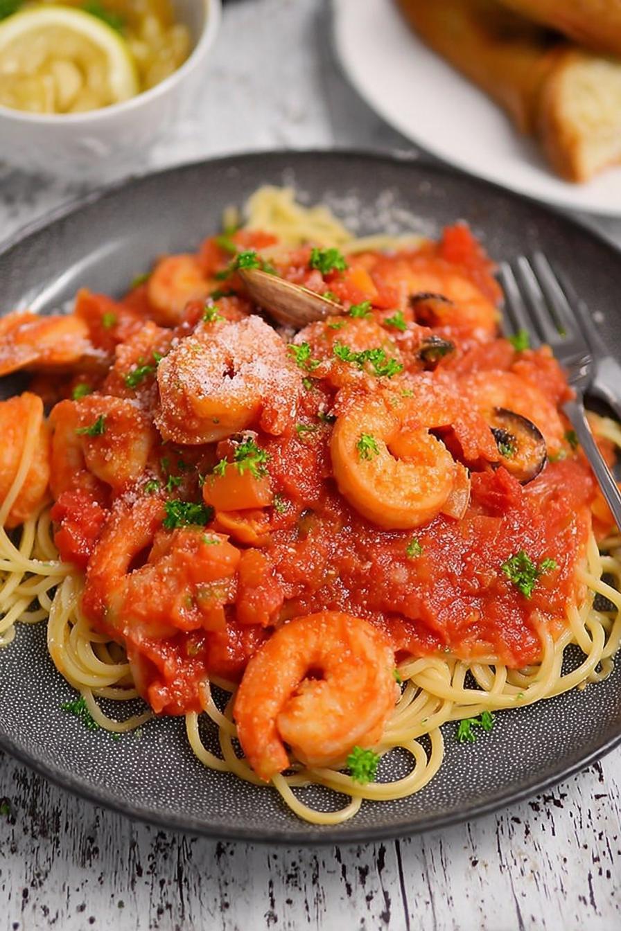 - 💡 Season late. Salt and pepper vanish in tomato layers early. Taste often near end. Burnt garlic means restart or risk grim bitterness. Spice balance adjusted incrementally next time. Seafood overcooked feels rubbery; cut simmer to bare minimum after addition.