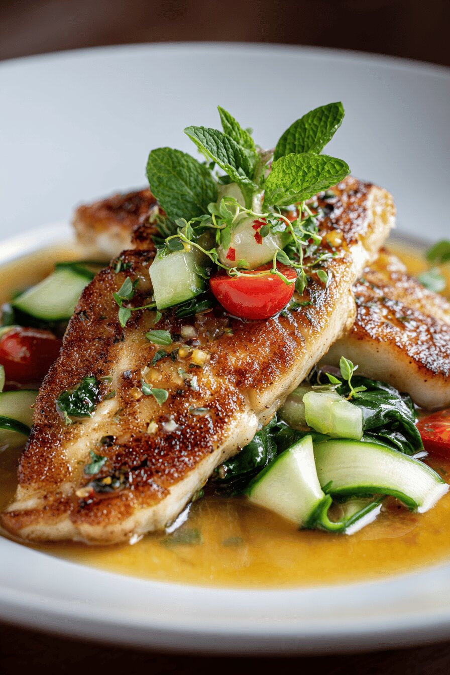 - Plate fish on greens or alongside. Spoon warm vinaigrette over fillets. Add cucumber ribbons for crunch if using. Serve immediately.