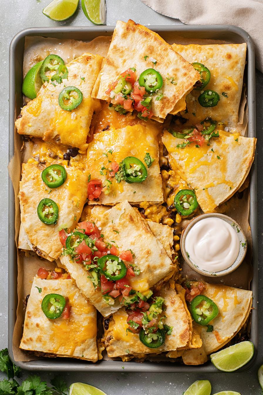 - 💡 Weighted second baking sheet crucial. Keeps quesadilla flat—without it edges curl, layers puff separate. Weight evenly. Cast iron skillet or heavy pan works too but no direct contact to avoid scorched spots.