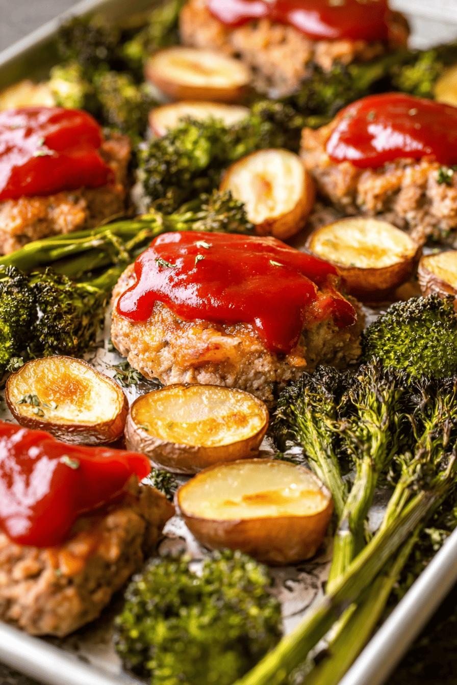 Ground turkey instead of beef keeps this lean but watch for dryness—egg and ketchup balance moisture. If pressed for time, pre-chopped frozen bell pepper or onion works but don’t skip pulse step; texture matters here. Swapping smoked paprika adds a deeper smoky undertone, but feel free to revert to Italian seasoning or add a pinch of chili powder for heat. Panko breadcrumbs absorb moisture without weighing down like regular crumbs. Fresh broccolini preferred — frozen can get mushy but can substitute if roasted longer and spread thin. Baby potatoes best if halved to cook quickly and get enough crisp skin—regular potatoes take longer and need adjustment. Olive oil is king here—enough to coat but not drown veg so they crisp without frying. Garlic salt saves time, but fresh minced garlic tossed in with the veg if you have extra boosts aroma. Ketchup topping optional but locks in glaze and adds sharp contrast; no need for sugar or extra honey.