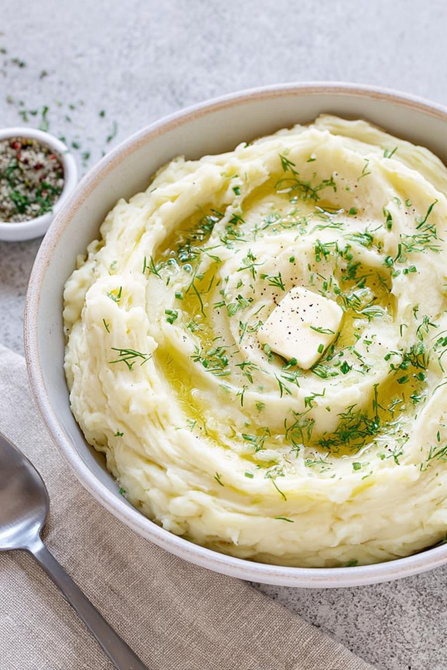 - Scatter chopped chives over steaming mounds just before serving. The fresh green flecks on creamy white contrast and their mild onion pop plays well with dill. The mash arrives mousse-soft and bursting with garlicky-herbal hints without overpowering. Serve alongside roasted chicken or grilled steak for a no-fuss crowd-pleaser.