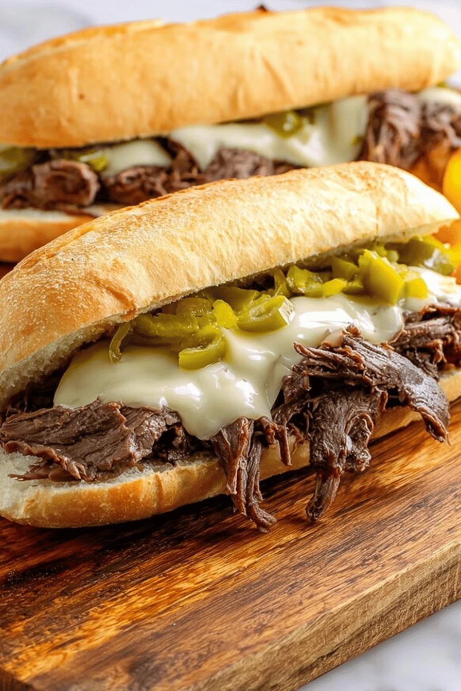 - 8 Serve these sandwiches with a few fresh pepperoncini halves and a small ramekin of the beef jus for dipping. The heat and acidity from the peppers cut through the richness.