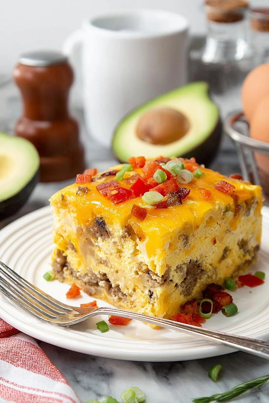 Test it with a fork or skewer in the center. The eggs should be firm. Not runny. If you hit a pocket of raw egg, give it another 20 minutes. Hash browns should be tender but with a tiny bit of bite — not mushy, not crunchy, just cooked through.