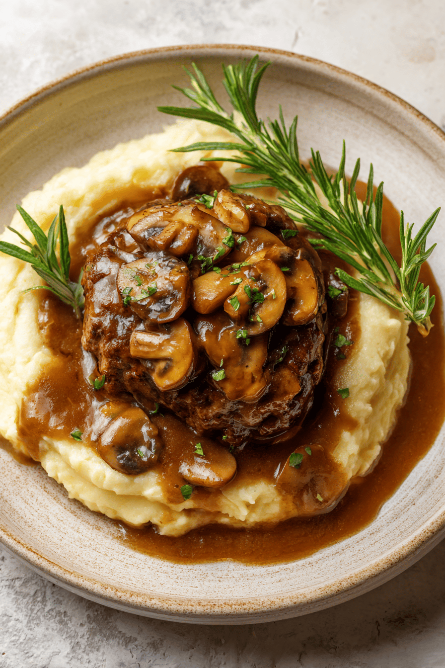 Frozen beef patties, sometimes overlooked but convenient. I learned that browning them right, crisp edges before simmer, locks flavor and juices. Mushrooms add juicy texture and earthy aroma—oyster mushrooms especially good here, not the bland button ones. Butter carries flavor but olive oil works if dairy’s no-go. That flour sprinkle is a must: not just thickening, it builds a velvety coating you want clinging to the meat. These cook quick, 40 minutes tops but you gauge doneness by color and firmness. I always check the juices instead of timer alone; it saves dry meat disasters. Sauce bubbles thickly before patties rejoin, no lumps, no raw flour taste. Served over creamy corn-infused mashed potatoes with a spicy butter kick—comfort food elevated by simple swaps and cooking smarts.