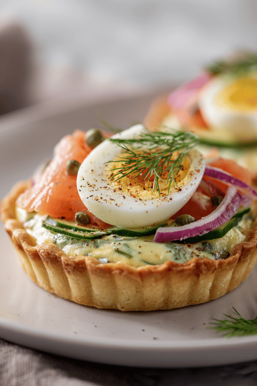 - 💡 Whip cream cheese and sour cream blend for tang and silk. Use fresh dill chopped well, fold gently to keep airy texture. Spread warm tart base thin layer; warm crust absorbs fat better, stops slipping layers. Layer fish thin; trout subtler than salmon, less oily. Press pickled onion lightly on fish to keep crunch, no dripping moisture. Add cucumber slices and capers last for bursts of salt and cool crunch.