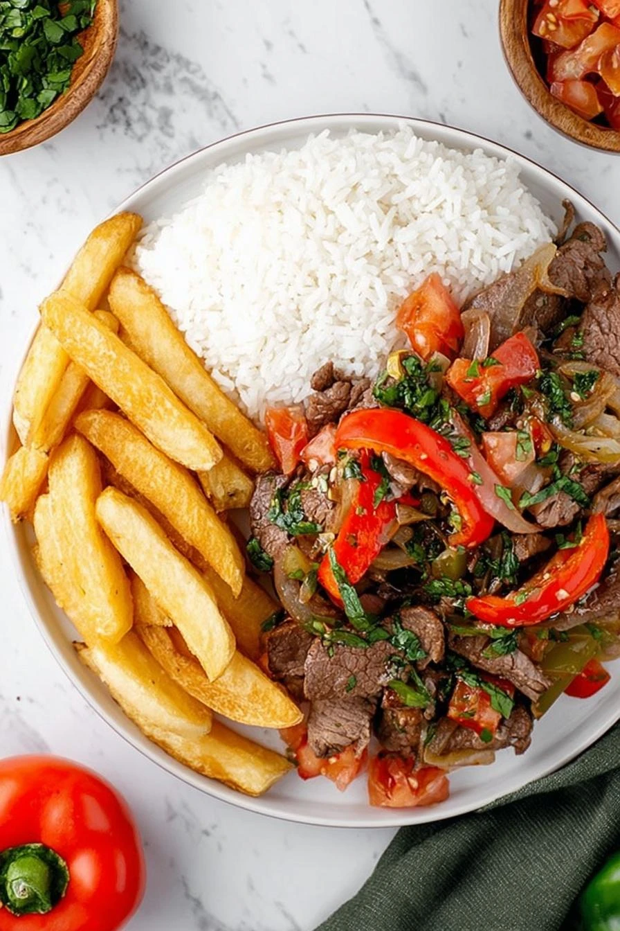- Step 4 === Portion cooked jasmine rice among plates. Spoon beef-vegetable stir fry over rice. Divide fries evenly, place beside beef rather than mixed in until right before eating — fries get soggy fast once wet. Serve ASAP for crisp edges and warm juicy meat contrast.