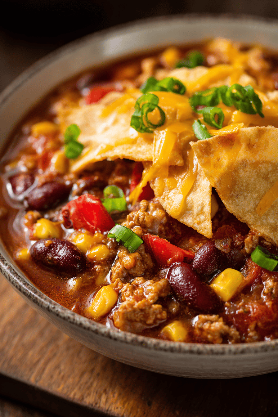 Savory pork chili loaded with veggies simmered with spices, topped with cheesy tortillas creating a crispy crust. Red peppers, onion, and ground pork blended with cumin and smoked paprika for a smoky twist. Baked with melted cheese sealed in wheat tortillas. Hearty and warming, with a bit of sweet corn and tomato base. Rinsed kidney beans add texture and protein. Quick-prep dish, midweek comfort. Lean pork and simple pantry spices. Totally removable crust from traditional pie. Slightly altered cooking to tweak flavor and texture balance.