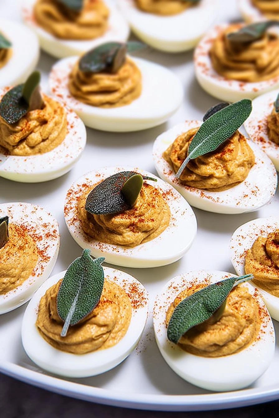 Takes 30 minutes start to finish. Works as an appetizer for fall gatherings, Halloween parties, or any time you need something that looks impressive but isn’t — cream cheese and pumpkin puree do all the heavy lifting while you fry three seconds of sage. The filling gets creamy without being heavy. Pumpkin adds that seasonal warmth without tasting like dessert, and smoked paprika brings smoke that makes people ask what’s different about your deviled eggs this year. Fried sage on top. That’s the crunch part. Most people don’t expect it. You can make these ahead. Chill them. Bring them out cold or let them sit on the counter for ten minutes before serving.