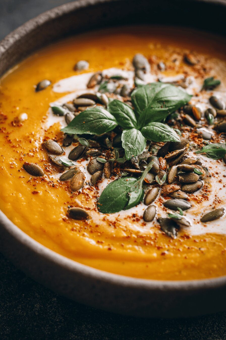 Pumpkin roasting smells like fall but with a twist—like a whisper of smoke and fresh herbs. Parsnips replace carrots, richer and earthier. Coconut oil swaps butter. Bright basil and thyme mix fresh and fragrant, popping against mellow squash. Skipping chicken broth for vegetable broth keeps it vegan, light but hearty. A swirl of coconut cream gives velvety finish without dairy heaviness. That toasted pepita crunch? A must-have, more than garnish. Timing tweaks—roasting longer for tenderness, simmer extending to coax flavors out fully. Mixes old and new, somewhere between rustic and refined. Soup thick but not stodgy, bright not bland, simple but unboring.