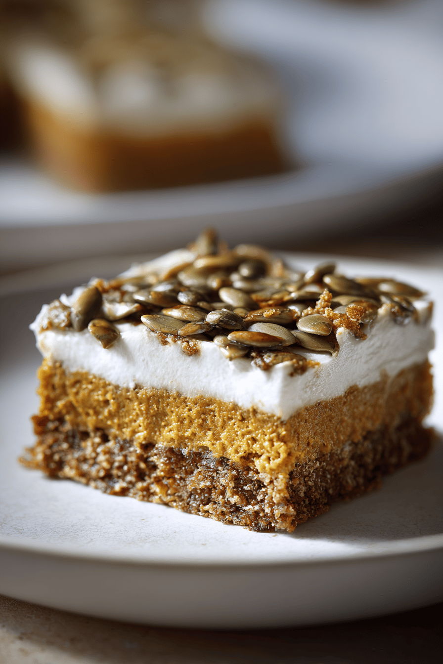 Preheat oven fully before batter gets ready, trapeze layering ensures even cooking. Batter is thick but stir gently to avoid tough gluten. Bake first layer slightly longer (+2 min) to prevent soggy base from pumpkin topping. Pumpkin filling baked til soft but still shakes—a slight jiggle perfect for texture. Seeds cooked slowly on medium heat to avoid burning; stir constantly to caramelize evenly. Cool seeds thoroughly to harden candy coating. Whipping cream beaten to soft peaks to prevent over-whipping, which leads to grainy texture. Chill cake minimum 2 hours, overnight preferred for clean cuts and flavor melding. Use parchment edges to lift cake gently, prevents breaking. Slicing into 16 squares ensures manageable serving size. Top with cream and seeds just before serving to keep crunchy contrast crisp. Store airtight, layers keep moist without sogginess for 3 days. Freeze after chilling rather than fully baked for best structure and thaw quality.