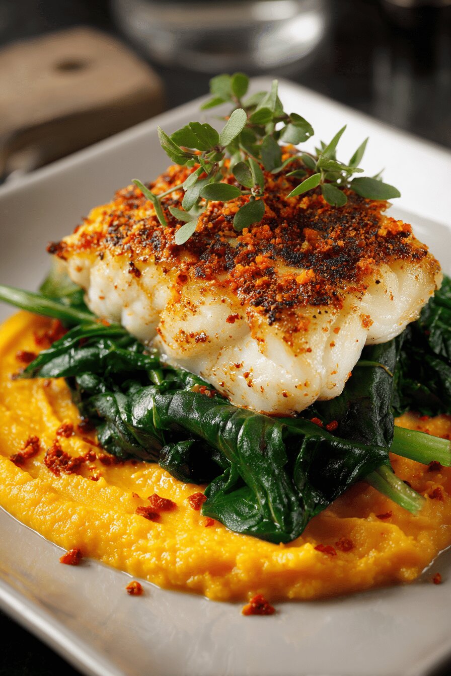 - 8. Place carrot purée in the center of warmed plates. Spoon blanched Swiss chard evenly around or on top against purée for a wet-dry texture contrast. Gently lay spiced fish portions atop greens. Splash extra virgin olive oil or a squeeze of lemon for brightness, if you like.